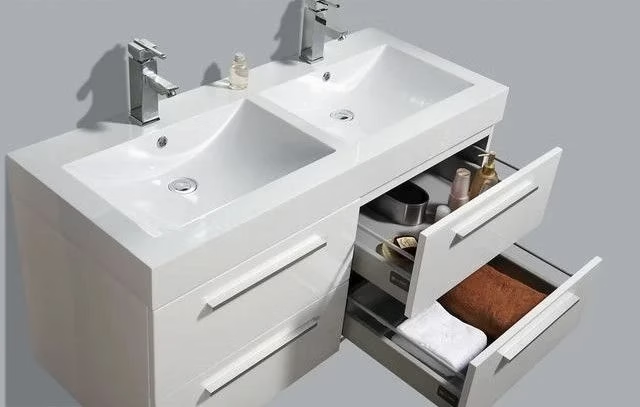 Deze hangende badkameronderkast straalt luxe en moderniteit uit met zijn strakke design en hoogglans witte afwerking. De MDF constructie zorgt voor duurzaamheid en betrouwbaarheid, terwijl de vier softclose lades zorgen voor een geruisloze en moeiteloze bediening.