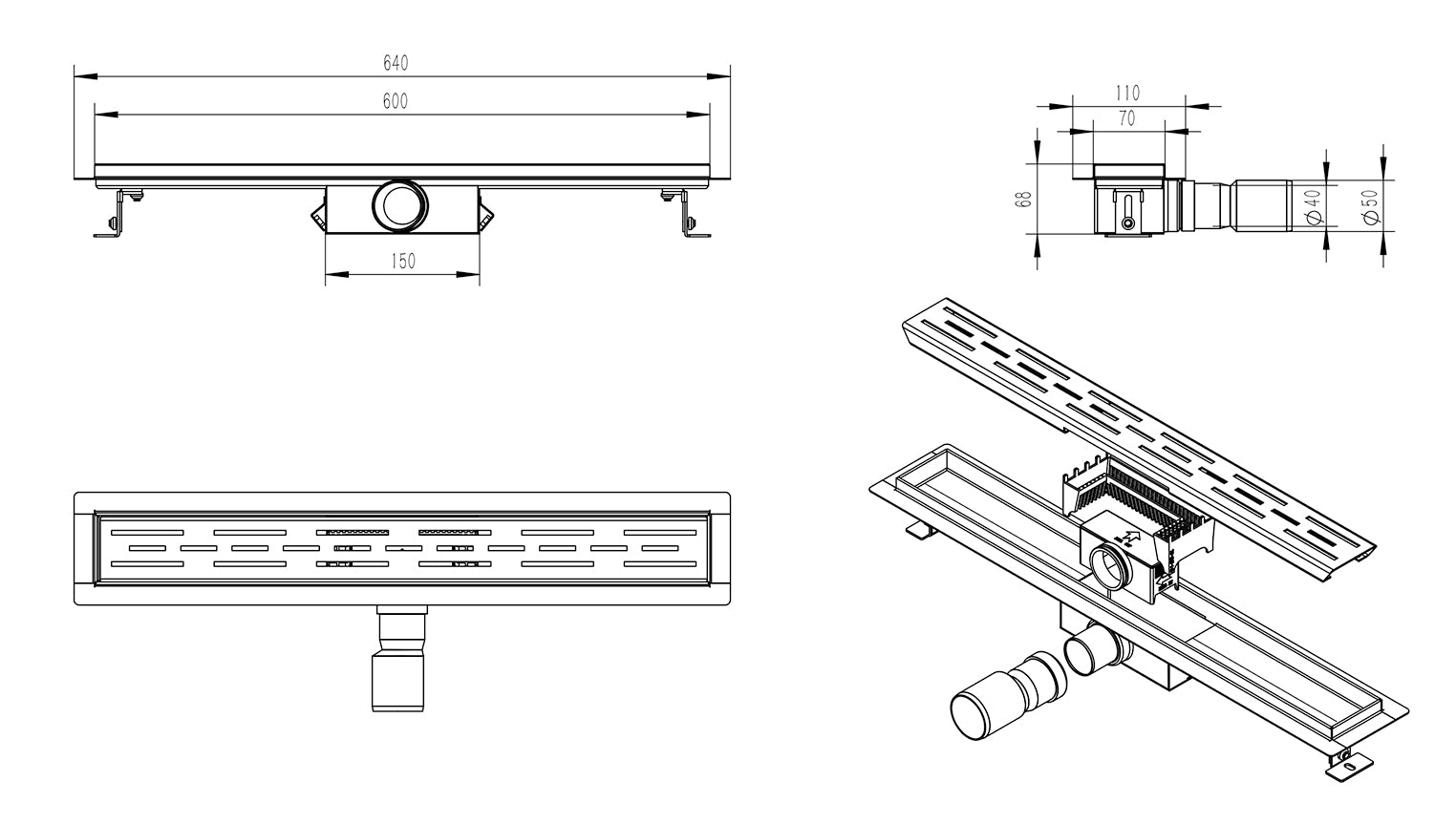 Wiesbaden douchegoot met flens en rooster 60 x 7 cm mat zwart