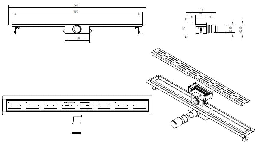 Douchegoot met flens en rooster 80 x 7 cm mat zwart