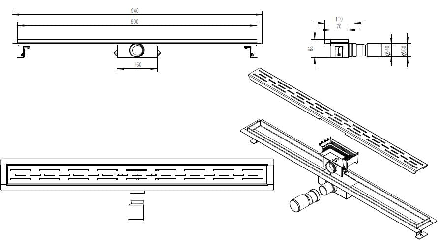 Douchegoot met flens en rooster 90 x 7 cm mat zwart