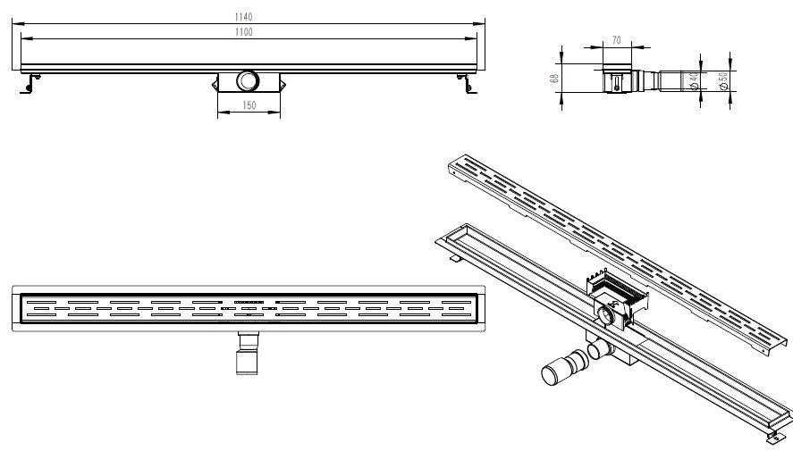 Eco douchegoot met flens en rooster 110 x 7 cm RVS