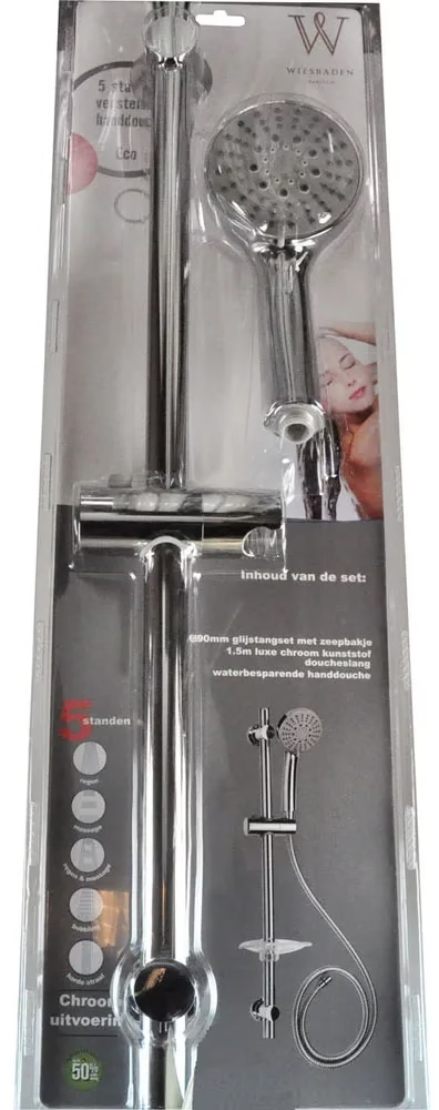 Glijstangset Chroom 5-standen handdouche met anti-kalk functie 1.5m chroom kunststof luxe doucheslang 690mm glijstang 580mm hart-afstand schroefgaten kunststof zeepschaaltje optionele waterbesparende doorstroombegrenzer bespaart tot 50% waterverbruik Universele conische 1/2″ aansluitingen Inclusief bevestigingssschroeven en pluggen in blister chroom
