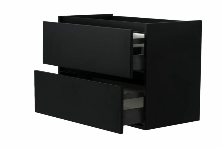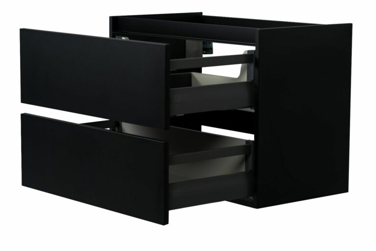 De mat zwart gelakte onderkast is gemaakt van MDF en heeft een strak en tijdloos design. De onderkast is niet alleen te combineren met een wasbak, maar ook met een topblad met waskom. De twee lades zijn voorzien van een Soft-Close systeem. Dit zorgt ervoor dat de lades altijd rustig sluiten. De onderkast heeft vier bevestigingspunten wat als voordeel heeft dat ook de zwaardere bladen prima bevestigd kunnen worden op de onderkast.