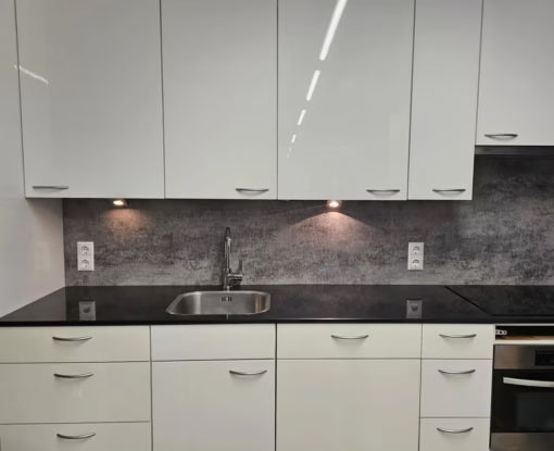 - Keuken Achterwand: Een matte keukenwand steenlook in Oxy Grey biedt een stijlvolle en tegelijkertijd zeer praktische oplossing als spatwand.