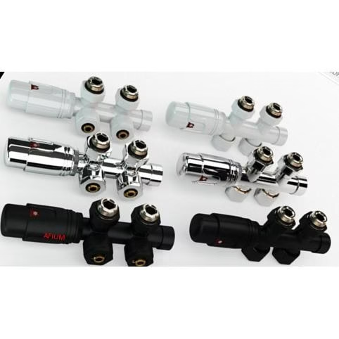Universele anti-vorst thermostatische aansluitset (MIDDEN-ONDER-RECHT) met onderblok. Toepasbaar op paneelradiatoren, verticale radiatoren en handdoekradiatoren.