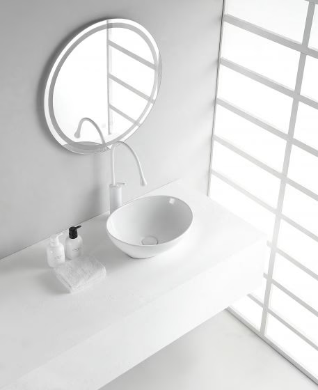 Ontdek de Wiesbaden Barco ovale opzetwastafel (40x33cm). Stijlvol wit keramiek zonder overloop. Perfect voor montage op een wastafelmeubel. Tijdloos design.